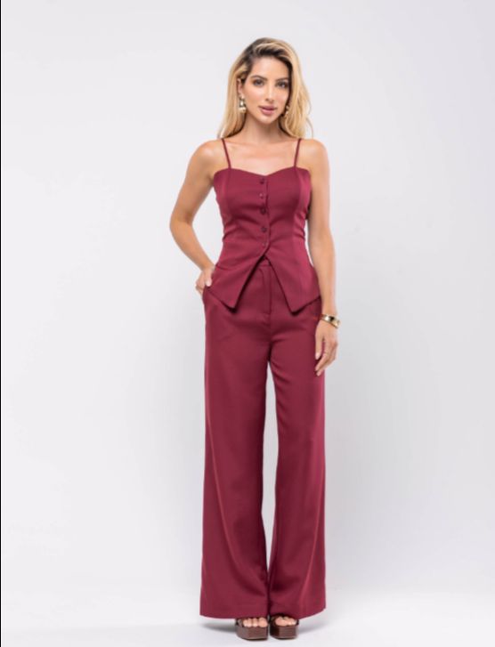 A escolha perfeita para quem busca sofisticação sem abrir mão do bem-estar. Este look deslumbrante, confeccionado no inovador tecido alfaiataria new look, é a materialização da elegância moderna. A Regata Corset, com seu design estruturado e botões frontais, valoriza a silhueta de forma impecável, enquanto a Calça Carol, de corte reto e caimento fluido, proporciona um movimento leve e chic. Ambas as peças contam com uma composição de 95% Poliéster e 5% Elastano no tecido principal, garantindo um toque suave e um ajuste confortável que se adapta ao seu corpo. Disponível em cores que vão do neutro clássico (Off White e Preto) aos tons terrosos e vibrantes (Bege, Marrom e o luxuoso Vinho), este conjunto é versátil o suficiente para transitar de um evento formal a um happy hour elegante. Invista em uma peça que combina a durabilidade da alfaiataria com a praticidade do elastano, e eleve o seu estilo a um novo patamar neste verão. Disponível nos tamanhos P, M e G.