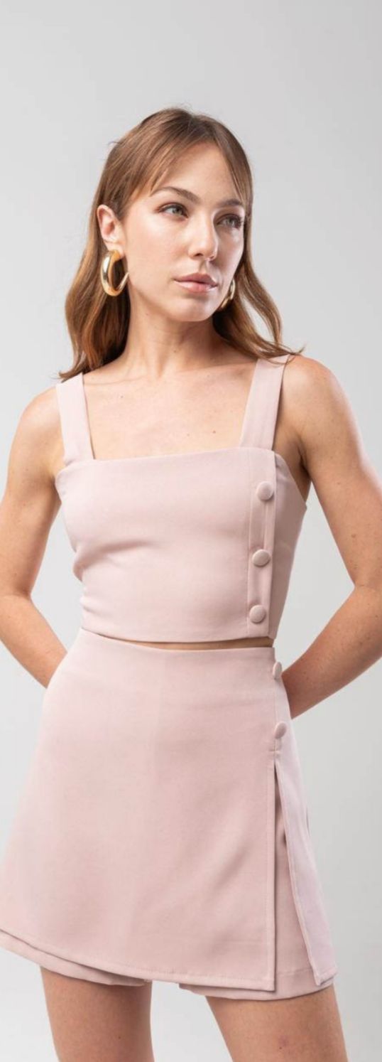 Esse conjunto entrega elegância imediata com um toque moderno que valoriza qualquer produção. O top de alça larga traz um caimento impecável, com botões frontais que deixam o visual ainda mais sofisticado e garantem aquele charme sutil que faz diferença. A saia-short complementa perfeitamente, unindo o conforto do shorts com a delicadeza da saia, criando um look leve, chique e super versátil para o dia ou a noite. O tecido de alfaiataria New Look oferece estrutura, beleza e um acabamento refinado que destaca a peça no corpo, enquanto as cores suaves trazem um ar romântico e atemporal. É o conjunto ideal para quem quer se sentir elegante, moderna e pronta para arrasar em qualquer ocasião.